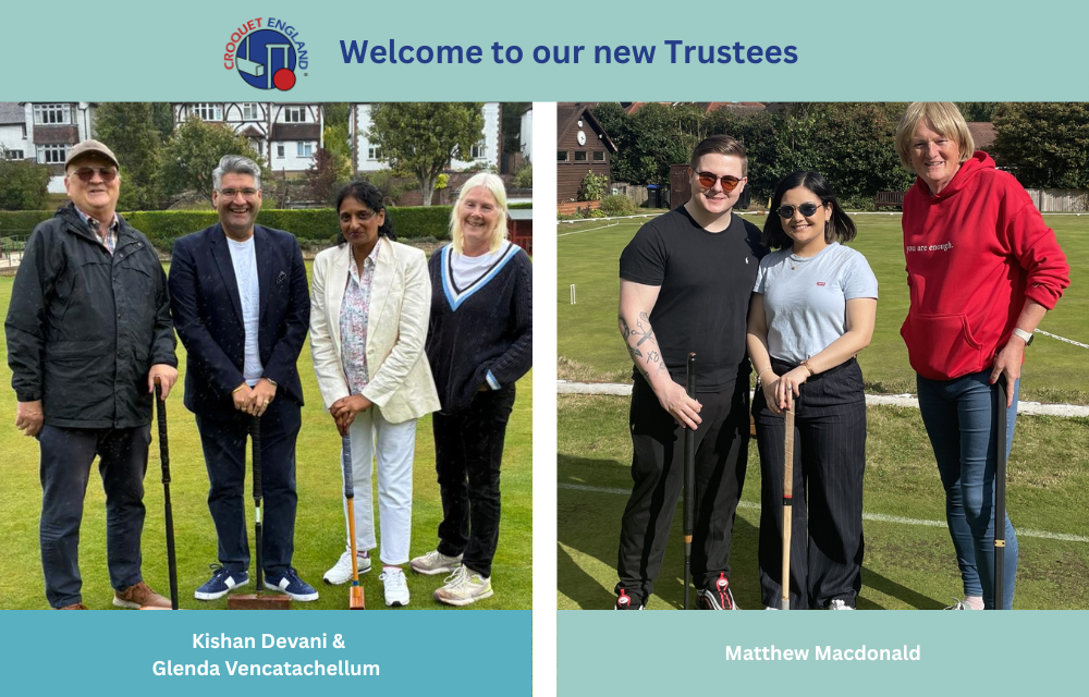 I am delighted to welcome three new Independent Trustees to the Board of Croquet England.  Independent trustees offer a fresh perspective from outside our sport, and bring additional expertise and experience.  I look forward to working with Glenda, Kishan and Matt.