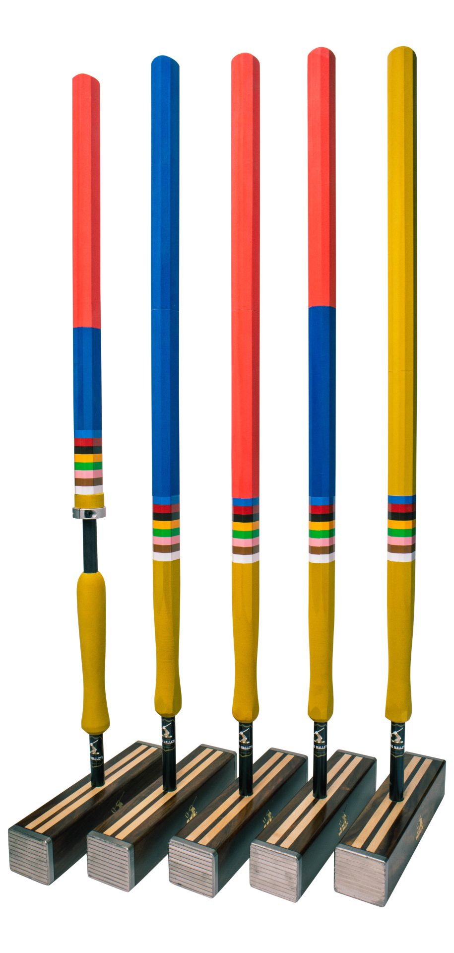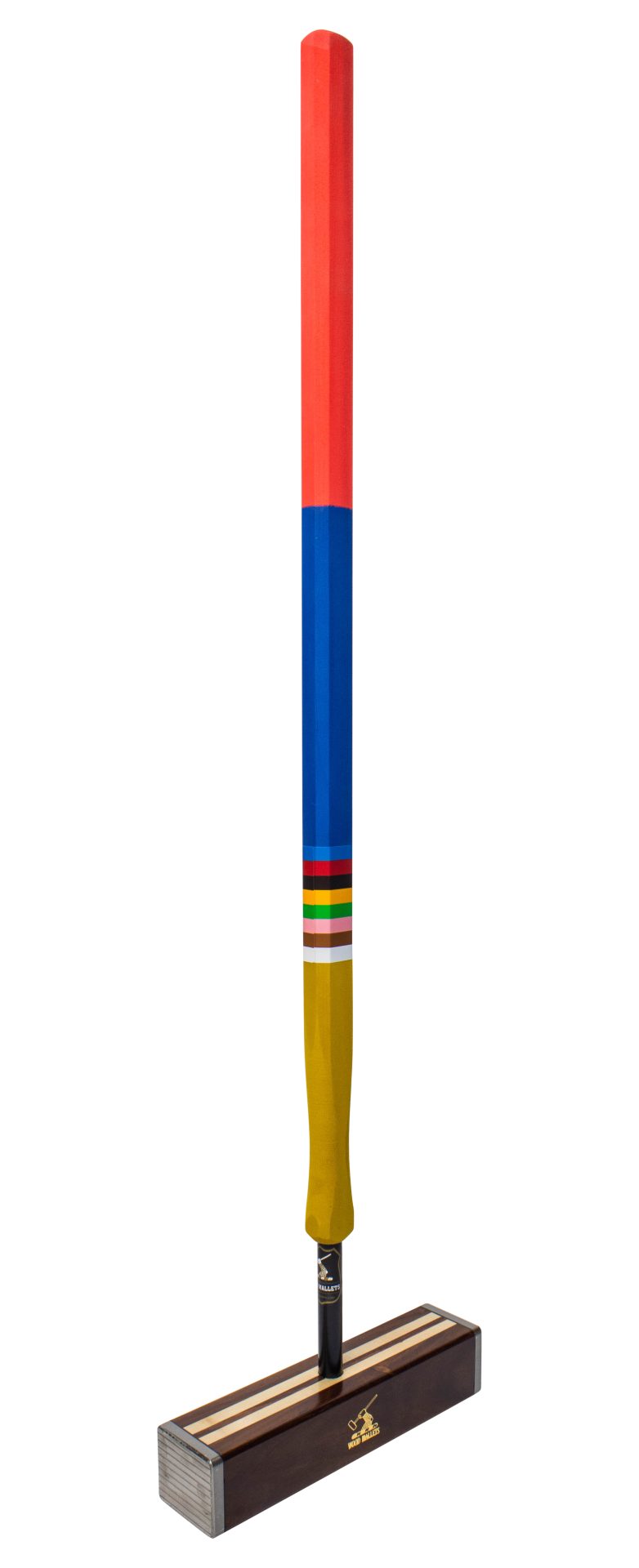 Milled stainless steel end plates provide peripheral weighting to an attractive Indian Sheesham hardwood and Sycamore head. The main concept of the laminated head is to reduce the weight of the wooden section so that thicker metal end plates can be used, thus maximizing the effect of peripheral weighting. It also increases the stability of the head by having the heavier wood on the sides. For longer or lighter heads a wider central core is used. By re-distributing some of the mass close to the striking faces, the moment of inertia is increased. This makes the head more stable during the swing, particularly for making accurate rushes, long roquets, and hitting-in. Also such a mallet turns less when shots are hit off-centre.