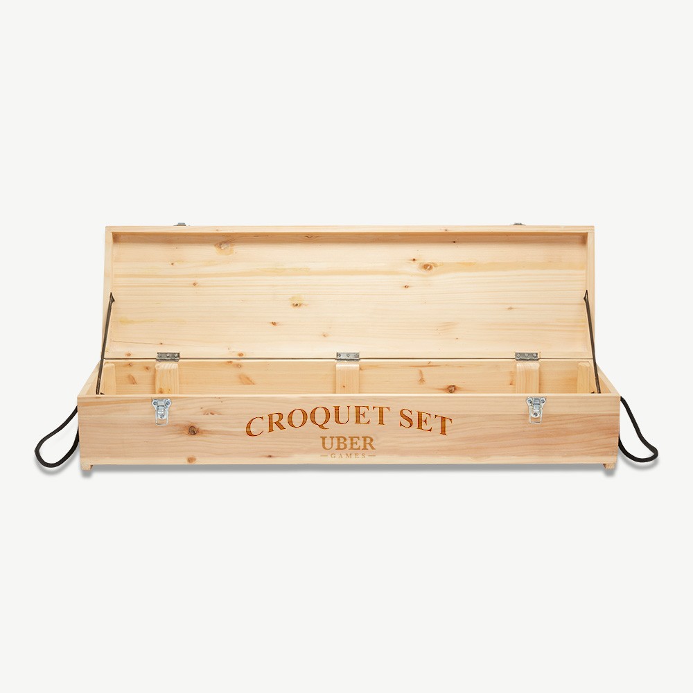 A traditional wooden croquet set storage box suitable for storing up to 6 standard size mallets and croquet equipment.